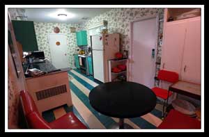 The 50’s era galley-style kitchen has a large pantry/mud room with exit to the garden, several appliances and a family eating nook. All laundry and utilities are conveniently located nearby with a slight descent from the main level.