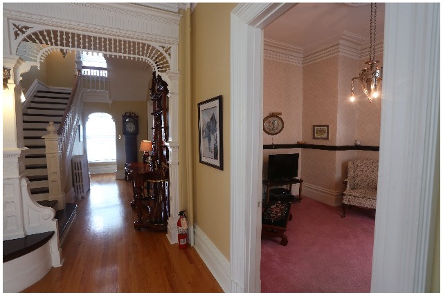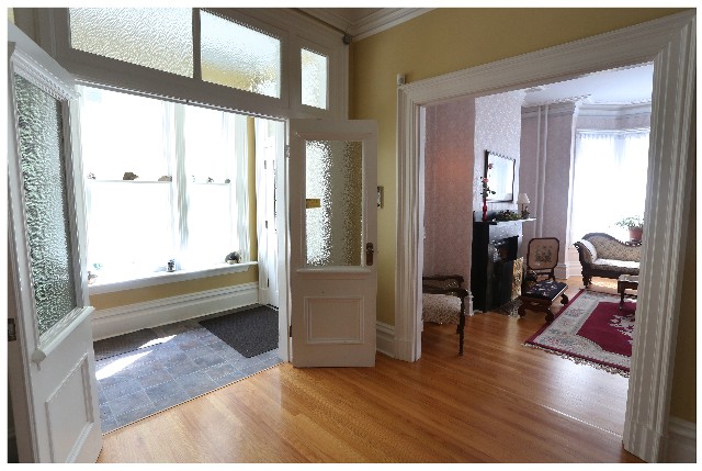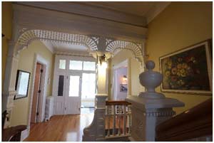 The moment you step up to the covered balustrade entry bridge, you get a sense that this may be a special home, and beyond the spacious porch, the dominant entry hall is most impressive, in the Eastlake style with lavish use of spindle work in the arched entry. This feature is repeated in the archway between the grand living room and dining room, both with ornate plaster cornices and rosettes and both with outstanding slate and tile fireplaces.