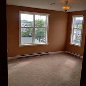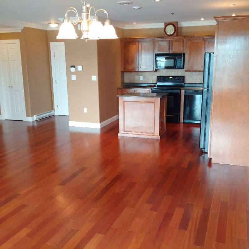 The condo has 9 ft ceilings , crown moulding, hardwood floors and carpet in bedrooms. The concrete floors ensure exceptional sound insulation