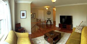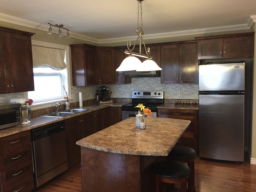 Kitchen with maple shaker cabinets, includes eating area and there is a spacious living room.
