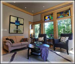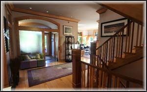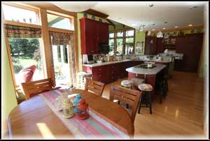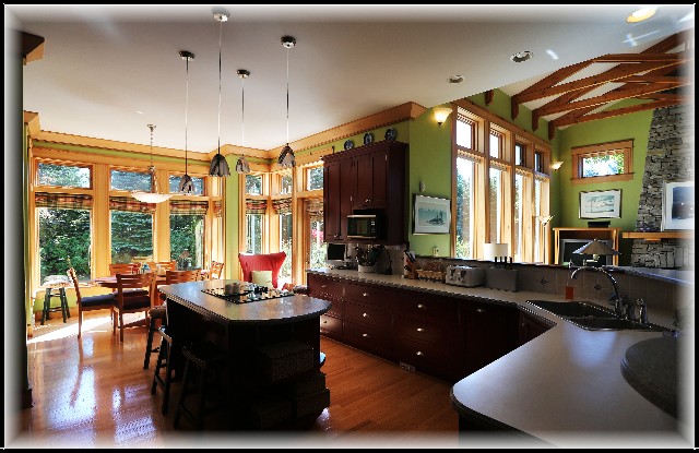 The main eat-in kitchen and family area has a dramatic 14 foot high, exposed truss ceiling with a soaring stone fireplace and windows galore, perfect for large gatherings at mealtimes and relaxing with friends. The kitchen has high quality cabinets, Corian counter details, and heaps of cupboard space with full pantry.