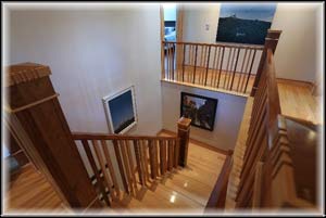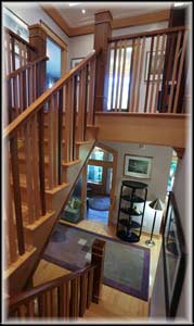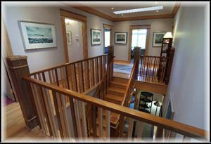 A modern wood-detailed stairwell design leads up to the four large bedrooms, large bright laundry room and open hallway well-lit by two large skylights. Three bedrooms have built-in, bump-out window desks, ideal for students or guests. The tiled master bathroom with step-up Jacuzzi and glass-block shower creates a perfect haven to relax.