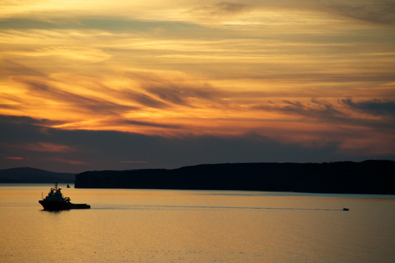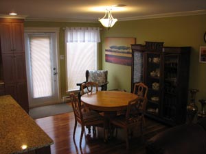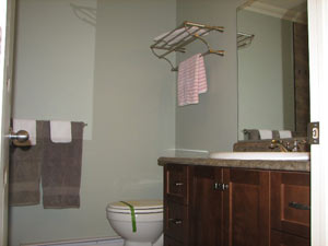 The gourmand’s kitchen, designed for cooking and entertaining, by Shiann Hynes is equipped with a large gas range and oven, double convection wall ovens, a 4 by 7 granite island, lit by halogen lights, pantry, and beautifully colour contrasted cherry wood floors that extend to the remaining open concept space, which includes dining and living area. This great room space, equipped high end media centre, has an outstanding view of Conception Bay and the signature sunsets. The propane heating stove, which works during power outages, can heat a 2000 sq ft house.