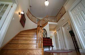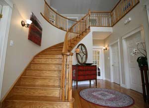 You now complete the circular flow back to the foyer where you ascend the winding staircase, leading to the four bedrooms, plus a study. The master bedroom is quite spacious and has an adjacent ensuite which connects to a large walk in closet. The study can be accessed from the walk in closet or from the landing which implies that this room can be used for a variety of purposes, possibly a fifth bedroom, a dressing room, etc.