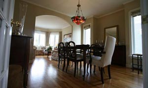 The living room, with bay window adjoins the dining room through an arched entrance, and in the dining room, the recessed space on the wall accommodates a sideboard without encroaching on space for guest seating.