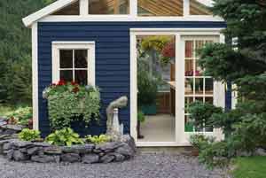 A Two-car garage for vehicles or sporting machines has been wired as an efficient workspace and can store an abundance of extra tools/toys in the peaked roof.