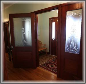 The recessed entry opens into a spacious front porch, after which you are welcomed through an etched glass door with etched glass side panels, to the wide and spacious from hall. Accommodations quarters are at the right, consisting of three bedrooms plus a nursery / office space, and a spacious living and dining room with double bay windows on the left, with kitchen at the back of the house. The living room fireplace in the craft motif style reflects the art deco influence, with geometric shape and rectilinear symmetry.